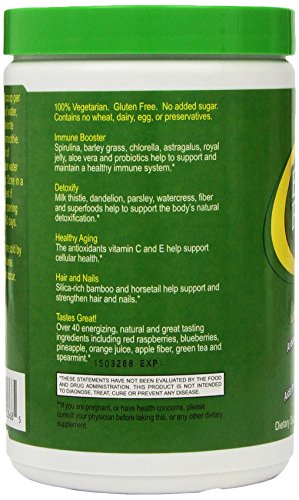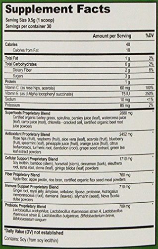 SUPERFOODS: Packed with 42 superfoods, probiotics, vitamins, and minerals; Contains the antioxidant power of 8-10 servings of fruits and vegetablesFree of any wheat, beans, yeast, spinach, nuts, sugar, fructose or dairy products