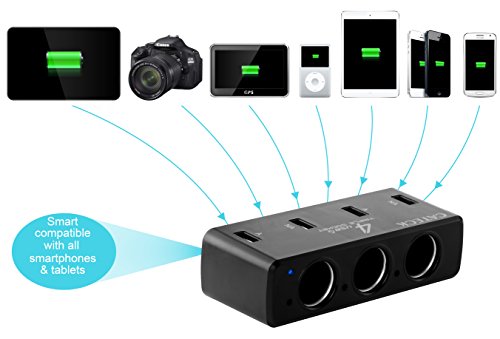 - Feature : It is specially made for power-hungry devices. Convert your car cigarette lighter socket into 4 high output USB charging ports as well as 3 Car Cigarette Lighter Splitter. / Charges and powers your devices through your car's cigarette lighter (DC outlet); 4 USB charging ports rapidly charge two personal electronic devices simultaneously. / A port for Apple Devices (also for Blackberry) and NA port for Non-Apple Mobile phones (like Samsung Galaxy S4, NOTE2 and HTC ONE) or other devices(Use your existing USB charging cables). / High safety standards: protective circuits and high quality components prevent the product or your devices from overheating or overloading. / Designed for traveling, car use, and an on-the-go lifestyle with a compact design that fits in your pocket; Input DC 12V / 24V compatible, USB Output:DC 5V 8A Max. or 40W.