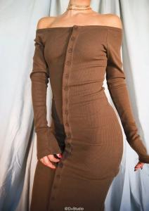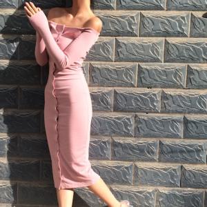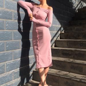 オフショルニットワンピース ひざ下 タイトワンピース フロントボタン リブニット 長袖 大人カジュアル セクシー オフショル