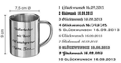 -. Feature : Trinkbecher-Thermobecher Isolierbecher mit Wunschgravur - die Geschenkidee für jeden Anlass. 0,3 Liter / Fassungsvermögen 0,3 Liter. Maße: ca. Ø 7,5 x 9 cm. Widerstandsfähig, bruchfest, edel. / mit Ihrer Wunschgravur, 10 Schriftarten zur freien Wahl, eigene Logos, Grafiken werden von uns einfarbig in Schwarz graviert / Achtung! Nach dem Kauf benötigen wir die folgenden Angaben direkt über den Amazon-Kontakt: wir Ihren Wunschtext oder Logo, Grafik und Ihre Wunschschriftart (z.B. Schrift 03) - erst dann können wir Ihren Artikel fertigen und an Sie versenden!!!