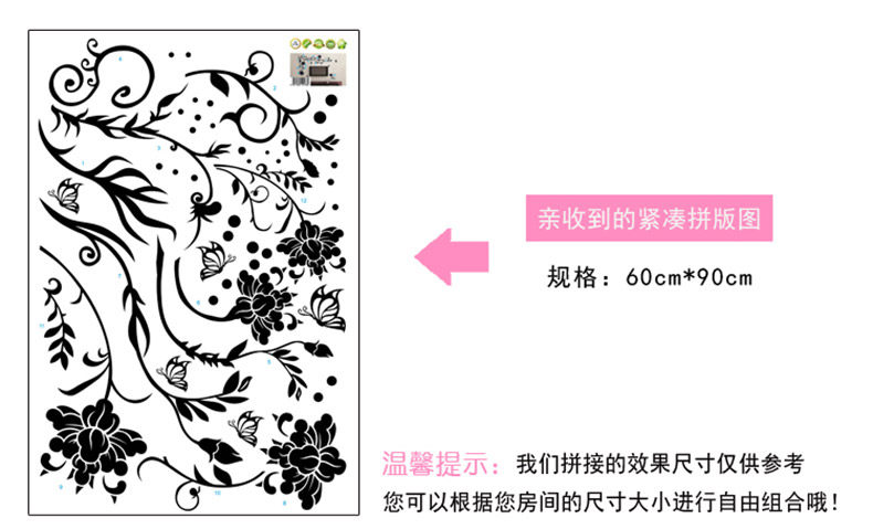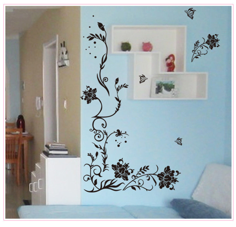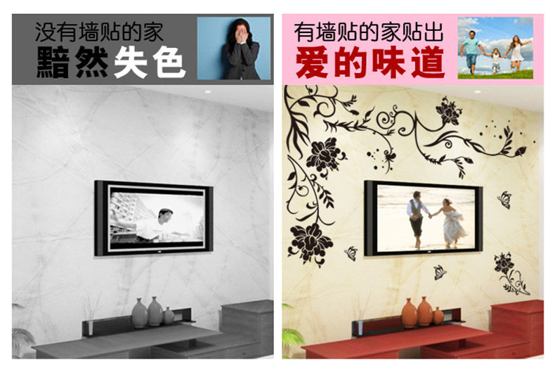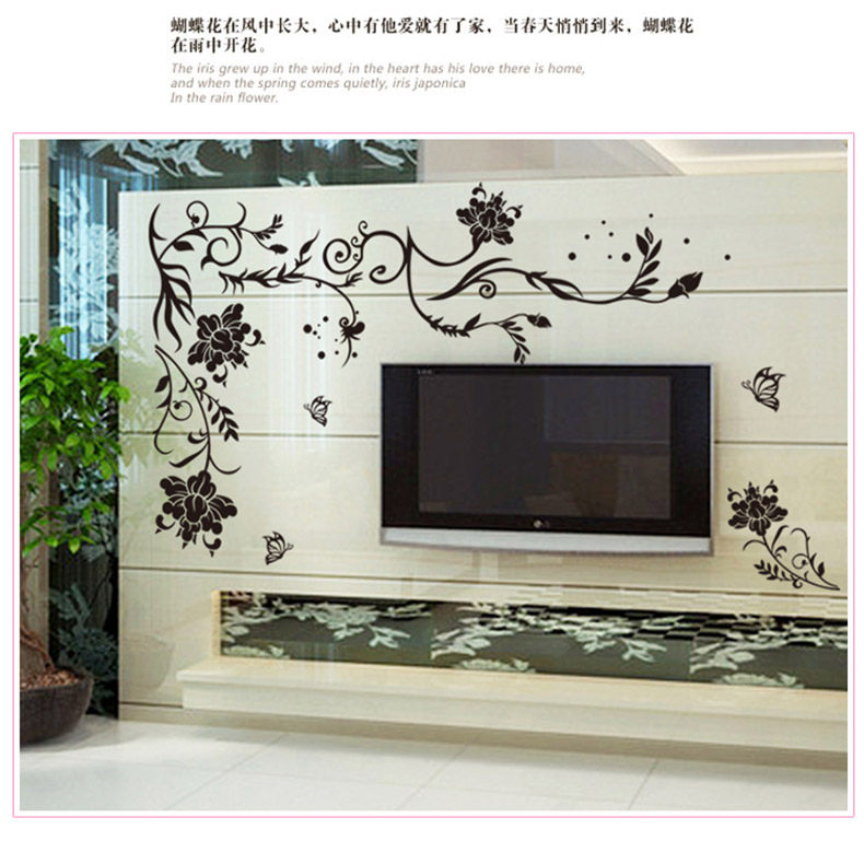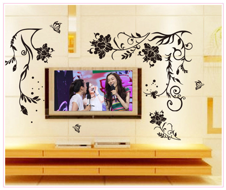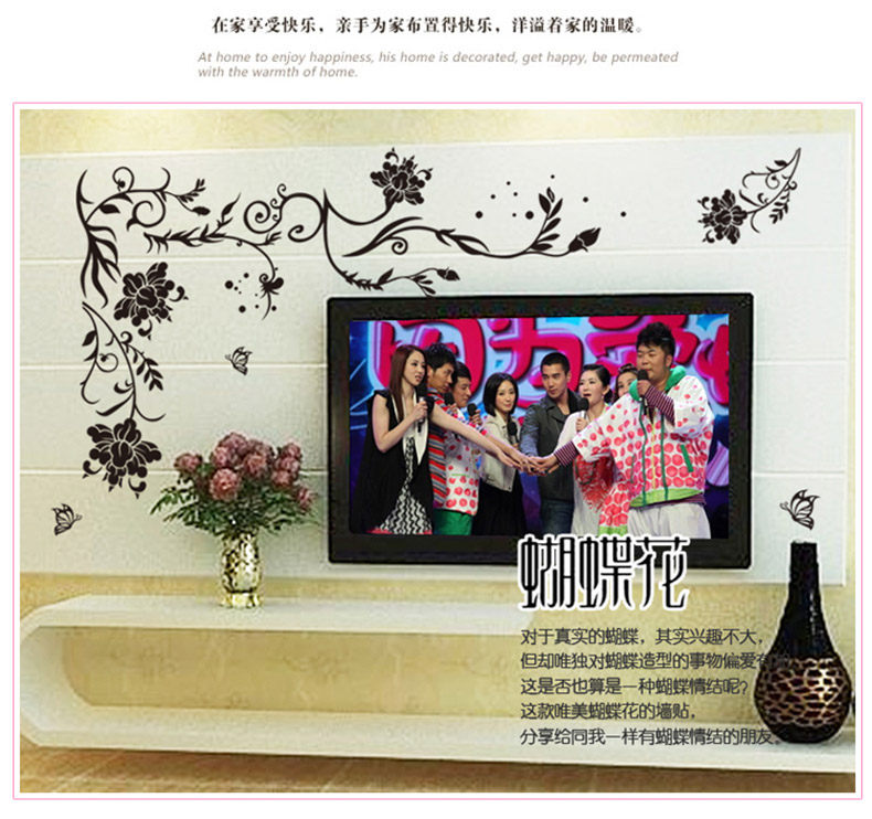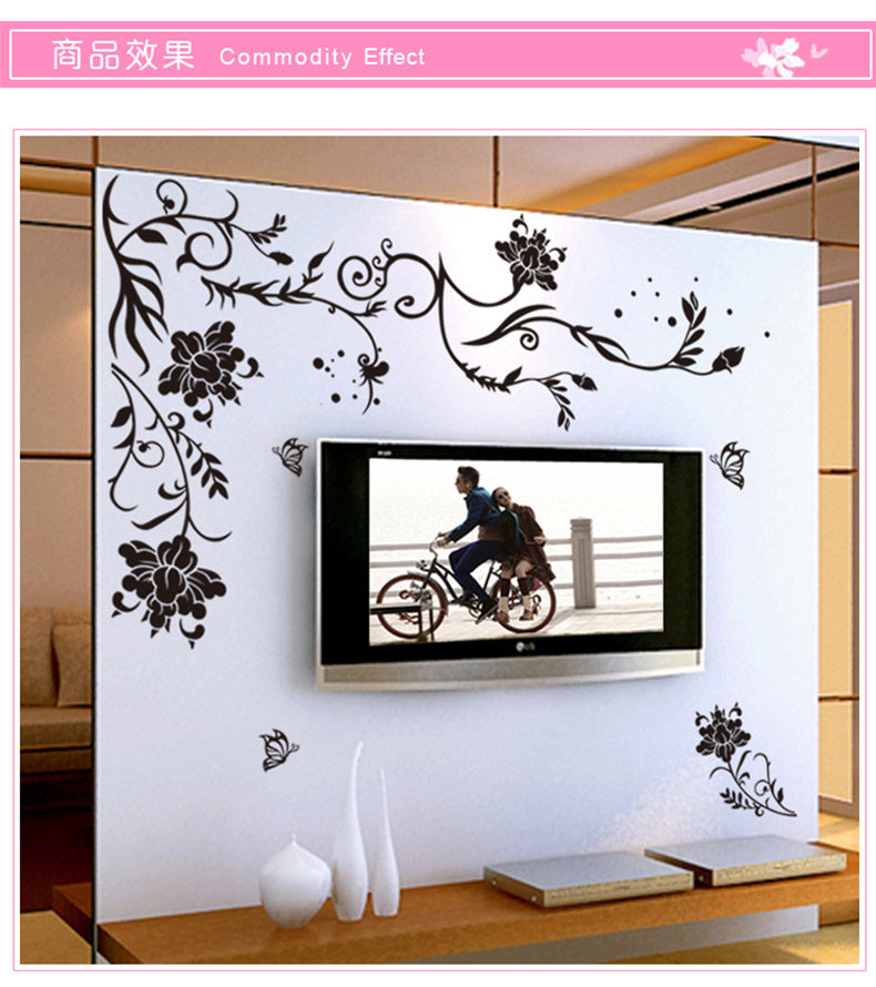 可移除墙贴纸贴画黑白色创意浪漫蝴蝶花藤电视背景墙客厅沙发装饰