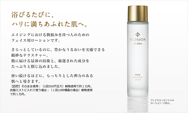 PLOSION(プロージョン) フェイスエッセンシャルローションは、エイジングにおける肌の悩みを持つ人のためのフェイスローションです。