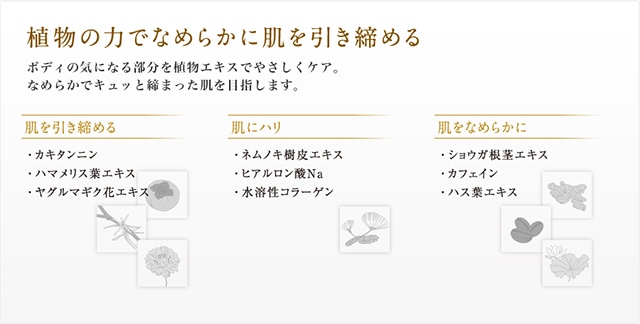 すみずみまでしっとりとなめらかな肌に整え、ボディを美しく引き締めます。