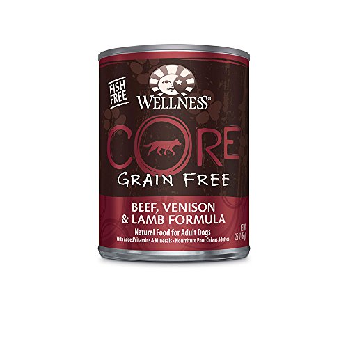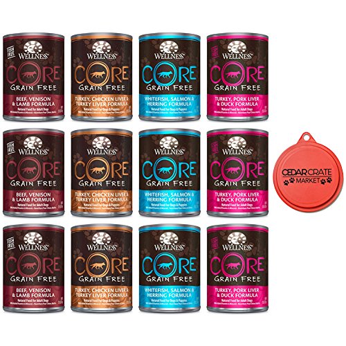 Wellness CORE Natural Grain Free Wet Canned Dog Food Recipes are healthy, 100% natural gluten free, grain free dog food for adult dogs made with natural ingredients with botanicals to help support inner wellness and fortified with vitamins and minerals, including fish and flax omega blend for healthy skin and coat. Each wet canned dog food can be served as a complete, balanced meal or can be added on top for an extra boost of protein. Wellness CORE grain free dog food formulas are based on the nutritional philosophy that dogs thrive on a diet mainly comprised of meat. Each grain free, nutrient-rich formula provides high quality protein for your dog. You'll receive: - (3) Beef, Venison, & Lamb Formula, - (3) Turkey, Pork Liver, & Duck Formula, - (3) Salmon, Whitefish, & Herring Formula, and - (3) Turkey, Chicken Liver, & Turkey Liver Formula. -(1) Can Topper Each can is 12.5 Ounces (12 Total Cans). Includes 1 Cat/Dog Food Silicone Can Cover to keep your pet food fresh while containing unwanted odors; has 3 built-in rings to fit all 3 popular sizes of canned pet food; BPA Free.Feature