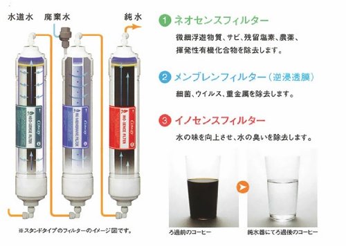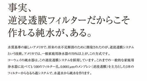 -. Feature : 逆浸透膜を通し、安全で美味しい純水を生成。 / 横幅26センチのスリムサイズ、スタイリッシュに仕上げられたボディはどんなキッチンにも馴染みます