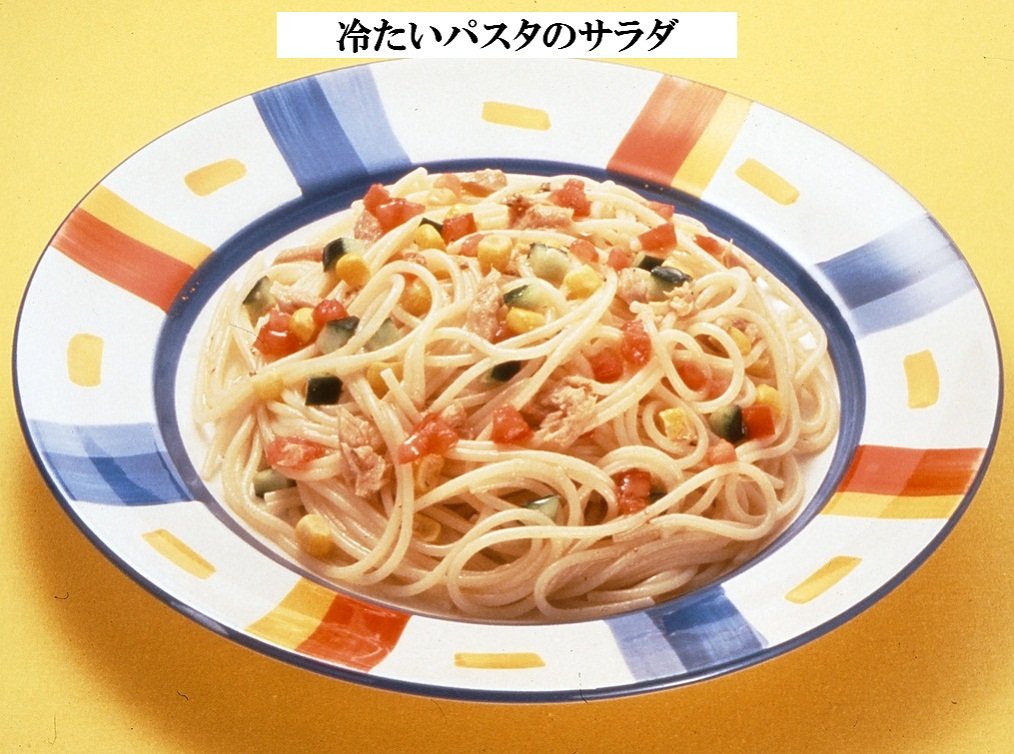 (2) Spaghetti 150 g (dried noodles) boiled with salt, boiled for 2 minutes longer than the display time of the bag, cool with running water and drain.
