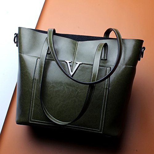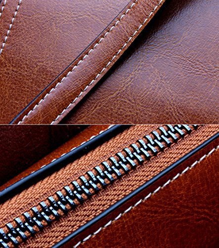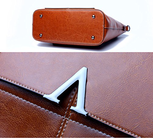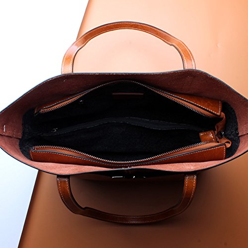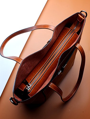 -. Feature : (Don't miss the limited deal - Save $10 with coupons)Material: soft cowhide leather, processed by oil wax, so that's why it looks bright. The lining is made from high class polyester, which has beautiful patterns. / External Features: 1. Zipper closure at the top. 2. The surface of the handbag is beautiful with delicate textures. 3. There is a back zippered pocket and front slot pocket. 4. Along with a removable shoulder strap, the length can be adjusted. 5. The bottom of the bag is protected by four metal rivets from abrasion. / Capacity: Opens to two big compartments; a large zipped pocket at the middle; a zippered pocket and two open slip pockets at each side. Please Note: this bag fits A4 size books & 11" laptop MAXIMUMLY.(If you put 13" macbook into it, the zip cannot be closed) / Practical & Simple: this stylish tote bag is perfect for traveling, business, school, working. / NOTE: One-Year-Warranty! Dimension: 11.8" x 10.6" x 5.1" (Length x Height x Depth) - Fits A4 Size and 11" Macbook Maximumly. The Inside Shoulder Strap is long enough, you can put this tote bag on your shoulder or cross your body.