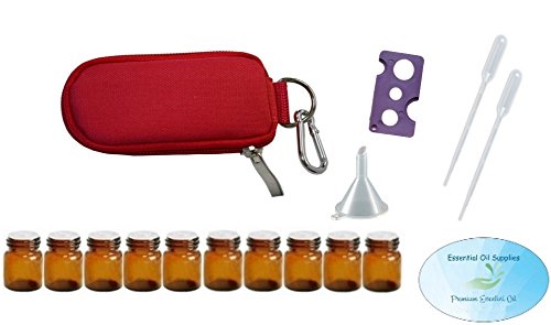 10 Bottle Essential Oil Padded Keychain Carrying Case Travel Bag (Red), 1ml Euro Orifice Reducer Bottles, Bottle Opener, Funnel, Pipettes