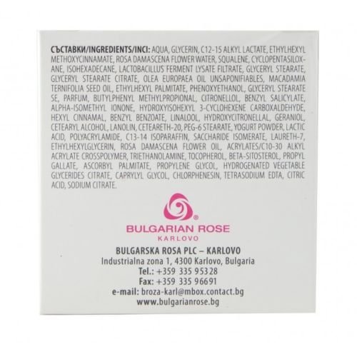 -. Binding : Misc. -. Brand : Rose Joghurt -. EAN : 0814520020345 -. Feature : A unique formula with participation of extremely effective active ingredients for rejuvenation, nourishment and protection of facial skin from daily stress and aggressive action of environment. Probiotic from yoghurt increases the supply of oxygen in skin cells, stimulates their renewal and strengthens the synthesis of collagen and elastin. Rose oil and natural rose water have an excellent hydrating, softening and energizing effect. / Pentavitin is a certified organic ingredient. It improves skin tone and elasticity. Included in the formation of the cream UV filter provides preventive protection of skin against sun rays. / Macadamia oil is an exotic vegetable oil and natural UV filter. It has nourishing and hydrating action, by giving the skin velvet softness and elasticity. / Squalene is unsaponifiable fraction of olive oil with prevalence of natural hydrocarbon squalene found in human sebum. It protects the epidermis from damages of the environment. Cosmetic advantages are: excellent emollient, moisturizing and softening action, extremely silk touch. / The cream is recommended for daily use. Active ingredients: rose oil, natural rose water, yoghurt, Lactobacillus bulgaricus, squalene, macadamia oil, Pentavitin and UV filter. -. IsAdultProduct : 0 -. Label : Bulgarian Rose karlovo -. Manufacturer : Bulgarian Rose karlovo -. MPN : EB -. PackageQuantity : 1 -. PartNumber : EB -. ProductGroup : Beauty -. ProductTypeName : BEAUTY -. Publisher : Bulgarian Rose karlovo -. Studio : Bulgarian Rose karlovo -. Title : Rose Joghurt Gentle Care Rejuvenating Face Cream with Natural Rose Water, Natural Rose Oil, Yoghurt, Lactobacillus Bulgaricus, Squalane, Macadamia Oil and UV Filter.1.7 oz/50 ml -. UPC : 814520020345