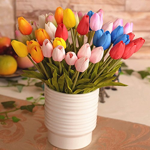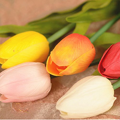 -Exquisite Appearance with High Quality The artificial tulips flowers bud and leaves are made of PU, making the tulips the same as real one with sweet smell and giving you a realistic touch.