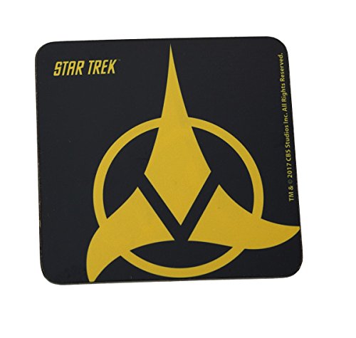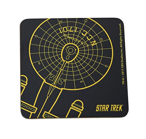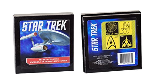 -. Brand : Star Trek -. Color : yellow, black -. EAN : 0871001009671 -. Feature : Includes: Enterprise, Vulcan Hand Salute, Command Badge, Klingon / Dimensions: : 3 3/4" by 3 3/4" / Comes in a Star Trek Gift Box / Officially Licensed Star Trek Product -. ProductGroup : Kitchen -. ProductTypeName : KITCHEN -. Title : Star Trek Cork-Back Coaster Set Enterprise/Vulcan/Klingon/Command Badge -. UPC : 871001009671