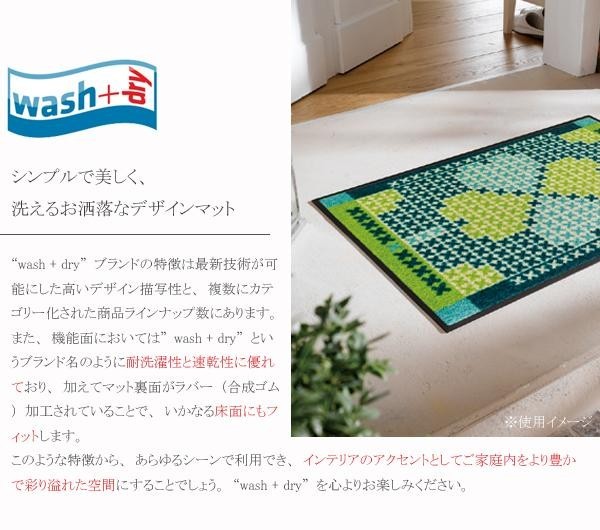 最新技術が可能にした高いデザイン描写が素敵なマットです。機能面においては「wash+dry」というブランド名のように、耐洗濯性と速乾性に優れており、加えてマット裏面がラバー(合成ゴム)加工されていることで、いかなる床面にもフィットします。あらゆるシーンで利用でき、インテリアのアクセントとして、ご家庭内をより豊かで彩り溢れた空間にすることでしょう。 |