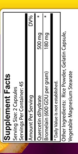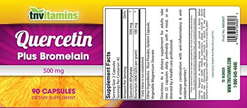 -. Binding : Health and Beauty -. Brand : TNVitamins -. EAN : 0095234260603 -. Feature : Supports Healthy Histamine Levels & Immune Function* -. IsAdultProduct : 0 -. Label : Total Nutrition -. LegalDisclaimer : Information provided is intended for general knowledge. It is not a substitute for professional medical advice or treatment for specific medical conditions. Always seek the advice of your physician or other qualified health care provider with questions you may have. Any information provided is not intended to diagnose, treat, cure or prevent any disease. These statements have not been evaluated by The USFDA. These products are not intended to diagnose, treat, cure or prevent any disease. -. Manufacturer : Total Nutrition -. MPN : AB6060 -. PackageQuantity : 1 -. PartNumber : AB6060 -. ProductGroup : Health and Beauty -. ProductTypeName : HEALTH_PERSONAL_CARE -. Publisher : Total Nutrition -. Size : 90 Capaules -. Studio : Total Nutrition -. Title : TNVitamins Quercetin Plus Bromelain 500 Mg- 90 Capsules -. UPC : 095234260603