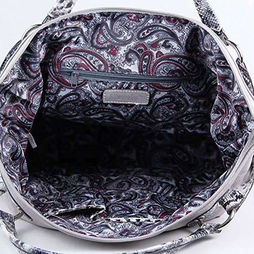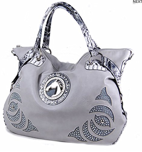 Large western horse handbag is made of grey imitation leather with fabric lining on the inside; show your love for equestrianism with this horse head handbag decorated with metal silvertone studs and rhinestones with croc print trim