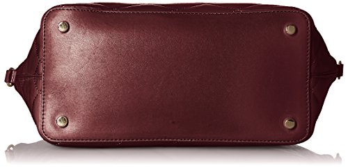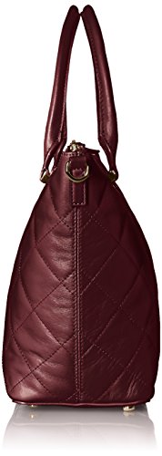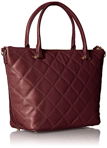 Zip-top handbag in quilted leather featuring dual rolled top handles with removable tag fob