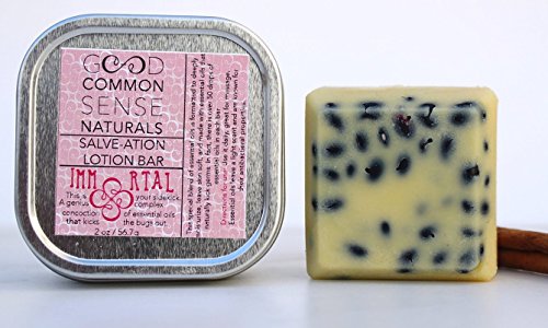 -. Binding : Misc. -. Brand : Good Common Sense -. Feature : Solid Massage Lotion Bar with Travel Tin - Great for hands and feet! / Cinnamon and Clove Essential oil - Great to boost Immunity health / nourish your skin with 100% shea butter and coconut oil / Protective blend that supports the body's defenses - Essential oil blend Anti-Viral, Antibacterial. / All Natural Essential oils only. No Fragrances or Colorants. -. IsAdultProduct : 0 -. Label : Good Common Sense -. Manufacturer : Good Common Sense -. MPN : GCS016SL01 -. PackageQuantity : 1 -. PartNumber : GCS016SL01 -. ProductGroup : Beauty -. ProductTypeName : BEAUTY -. Publisher : Good Common Sense -. Studio : Good Common Sense -. Title : Immortal Salve-ation Lotion Bar - Cinnamon Clove Essential Oil Solid Lotion Bar with Tin