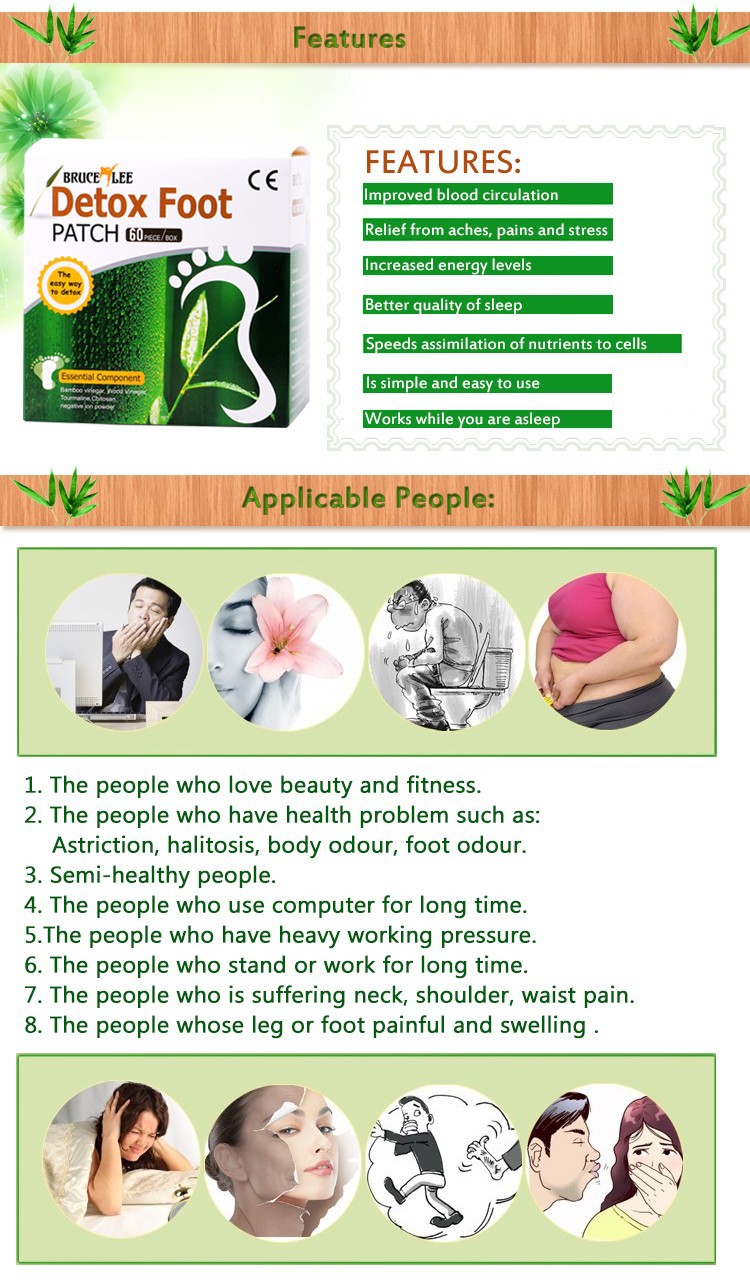 Working princple of detox foot patch 1. Past the detox foot patches on the sole of the foot before you go to bed, the patches warm up to open the pores to draw and absorb the accumulated wastes from osmotic pressure through the skin from the blood and lymph systems. 2. The next morning, remove the patches gently ,you may find it become darkened, greasy, moist! Applicable People: 1. The people who love beauty and fitness. 2. The people who have health problem such as: Astriction, halitosis, body odour, foot odour. 3. Semi-healthy people. 4. The people who use computer for long time. 5.The people who have heavy working pressure. 6. The people who stand or work for long time. 7. The people who is suffering neck, shoulder, waist pain. 8. The people whose leg or foot painful and swelling .