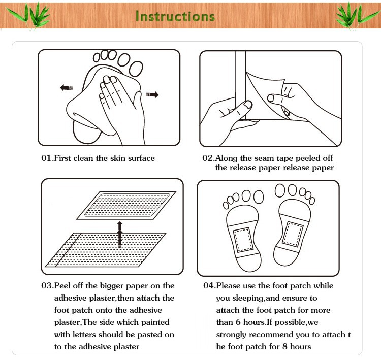 Instructions 1. Clean foot 2. Peel off the bigger paper on the adhesive plaster ,then attach the foot patch onto the adhesive plaster , The side which printed with letters should be pasted on to the adhesive plaster. (In other words ,the letters printed on the foot patch should not touch your skin ). 3. Attach the foot patch which is already on the adhesive plaster now onto your vola. 4.Peel off the smaller paper on the adhesive plaster, then attach the whole adhesive plaster onto your vola firmly. 5. Please use the foot patch while you sleeping,and ensure to attach the foot patch for more than 6 hours. If possible,we strongly recommend you to attach the foot patch for 8 hours. 6. Next morning,peel off the foot patch bag and clear the skin.. Storage: Store in dry & cool place, away from children and sunlight. Patch Size: 6×8cm Adhesive Sheet Size About 12×10cm