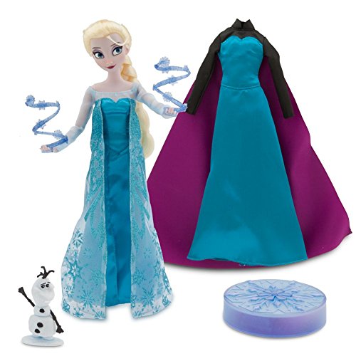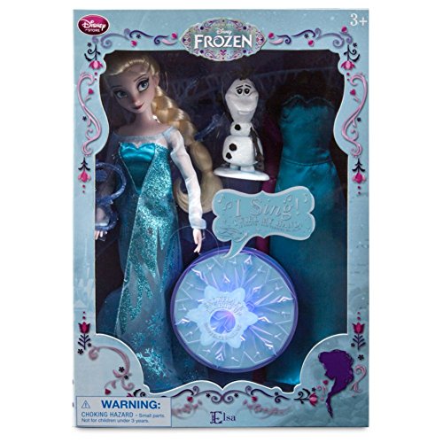 - Feature : Set includes: Elsa Singing Doll, two complete costumes, light-up snowflake disc, two removable ''icy power'' accessories, and Olaf figurine / Twirl Elsa's hand to hear her sing Let it Go / Detailed costumes with capes Satin and glitter accents / Press button on snowflake to see color change LED lights Scenic display packaging with window and self-stick fabric fastener / Ages 3+ Requires 6 x LR44/AG13 button cell batteries, included Plastic / polyester Doll: 11'' H