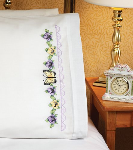 Janlynn Stamped Cross Stitch Kit, Pansy & Butterfly Pillowcase Pair