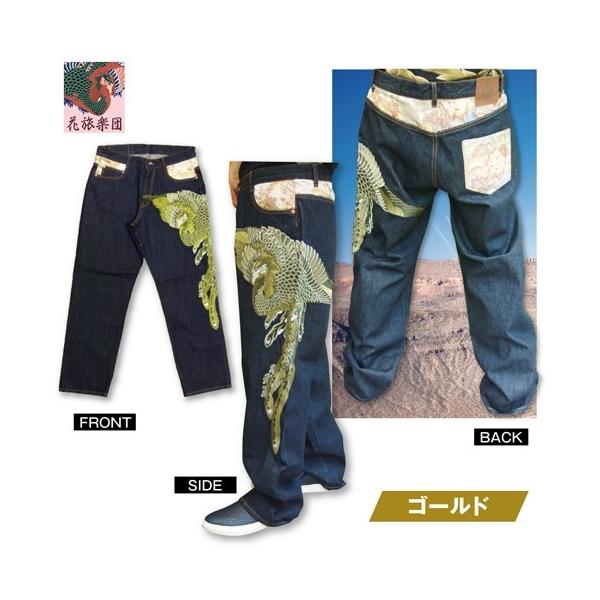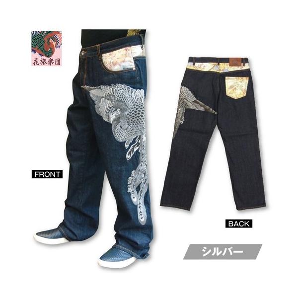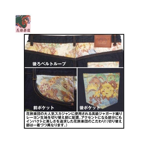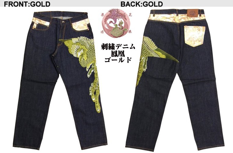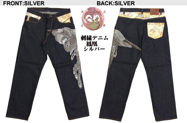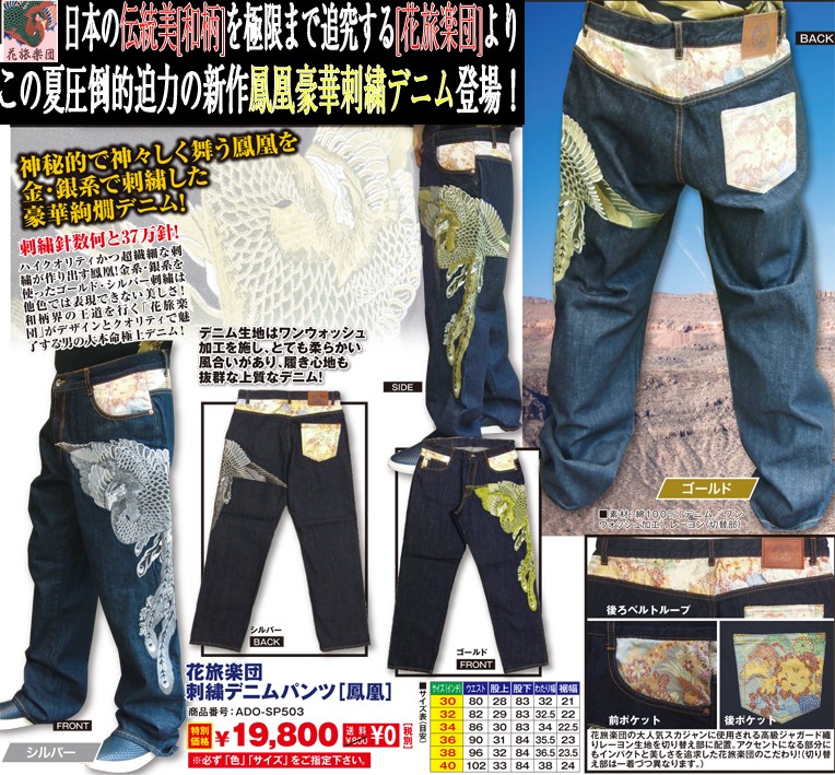 日本の伝統美〔和柄〕を極限まで追求する「花旅楽団」よりこの夏圧倒的迫力の新作鳳凰デニム登場!神秘的で神々しく舞う鳳凰を金・銀系で刺繍した豪華絢燗デニム新登場!刺繍針数何と37万針! ハイクオリティかつ超繊細な刺繍が作り出す鳳凰! 金系・銀系を使ったゴールド・シルバー刺繍は他色では表現できない美しさ! 和柄界の王道を行く「花旅楽団」がデザインとクオリティで魅了する男の大本命極上デニム! デニム生地はワンウォッシュ加工を施し、とても柔らかい風合いがあり、履き心地も抜群な上質なデニム! 花旅楽団の大人気スカジャンに使用される高級ジャガード織りレーヨン生地を切り替え部に配置。 アクセントになる部分にもインパクトと美しさを追求した花旅楽団のこだわり! (切り替え部は一着づつ異なります。)