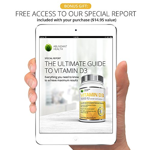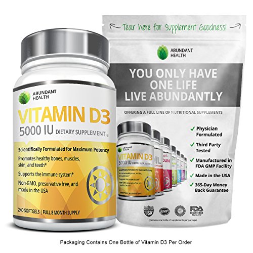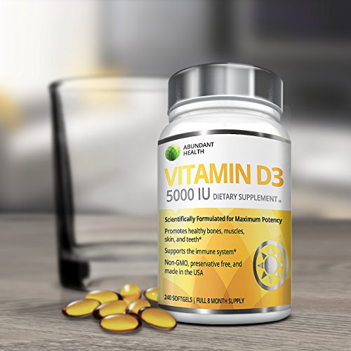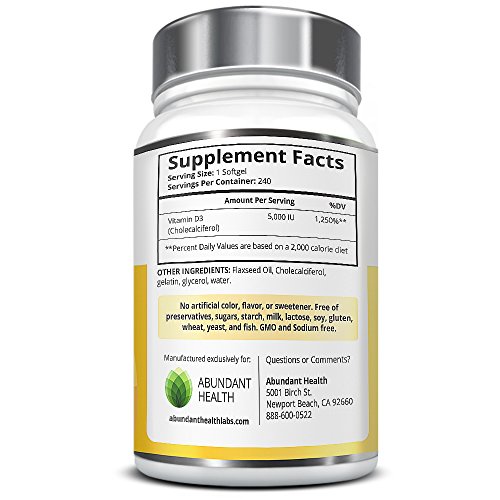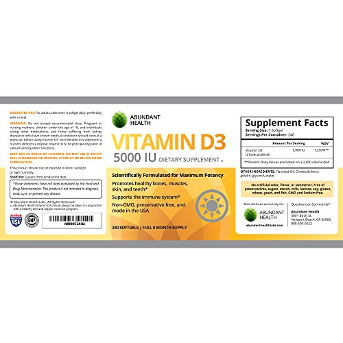 -. Binding : Health and Beauty -. Brand : Abundant Health -. EAN : 0784672321259 -. Feature : THE BEST SOURCE FOR VITAMIN D3: Our oral Vitamin D3 supplements are sourced from all natural lanolin, a safe and effective substance that produces the same Vitamin D found in human skin when exposed to the sun. / THE HIGHEST POTENCY VITAMIN D: D3 is the most bioavailable form of Vitamin D and supports bone, muscle, skin, and dental health and boosts the immune system. / THE BEST VITAMIN D3 FOR PEOPLE LOOKING FOR SAFE, PURE SUPPLEMENTS: Our fast dissolve, USP grade softgels are preservative free, gluten free, and GMO-free. / SCIENTIFICALLY FORMULATED FOR MAXIMUM QUALITY: Abundant Health goes the extra mile to ensure our supplements have passed extensive quality control tests before being bottled and sold. We use only FDA regulated, GMP certified manufacturing facilities in the USA. / BEST VALUE ON AMAZON! You receive a FULL 240 capsule, 8 month supply, FREE SHIPPING when you order 2 or more bottles, and our "best in the industry" 365-day Empty Bottle Money Back Guarantee! -. Label : Abundant Health Labs -. LegalDisclaimer : These statements have not been evaluated by the Food and Drug Administration. This product is not intended to diagnose, treat, or prevent any disease. Actual product packaging and materials may contain more and different information than what is shown on our website. We recommend that you do not rely solely on the information presented and that you always read labels, warnings, and directions before using or consuming a product. Please see our full disclaimer below -. Manufacturer : Abundant Health Labs -. MPN : VI-RWIM-T4SG -. PartNumber : VI-RWIM-T4SG -. ProductGroup : Health and Beauty -. ProductTypeName : HEALTH_PERSONAL_CARE -. Publisher : Abundant Health Labs -. Studio : Abundant Health Labs -. Title : VITAMIN D3 5000IU 240 Softgels - 8 Mo. Supply - From Lanolin, a Safe Source for High Potency Bioavailable D3 - Promotes Healthy Bones, Muscles, Skin, & Teeth - Can Help to Boost Immune System Support - Preservative Free, Non-GMO, Made in the USA -. UPC : 784672321259