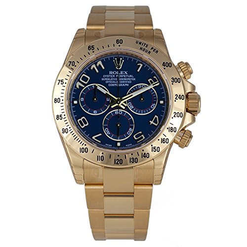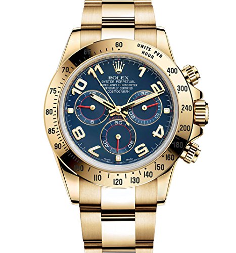 -. Feature : This is a Never Worn Timepiece that still has the factory original protective plastics on the case and comes with the Original Box and Papers. / Free Insured Overnight Shipping / 40mm 18K yellow gold case, tachymeter engraved bezel, screw-down push buttons, blue dial, Arabic numerals, and Oysterlock bracelet.
