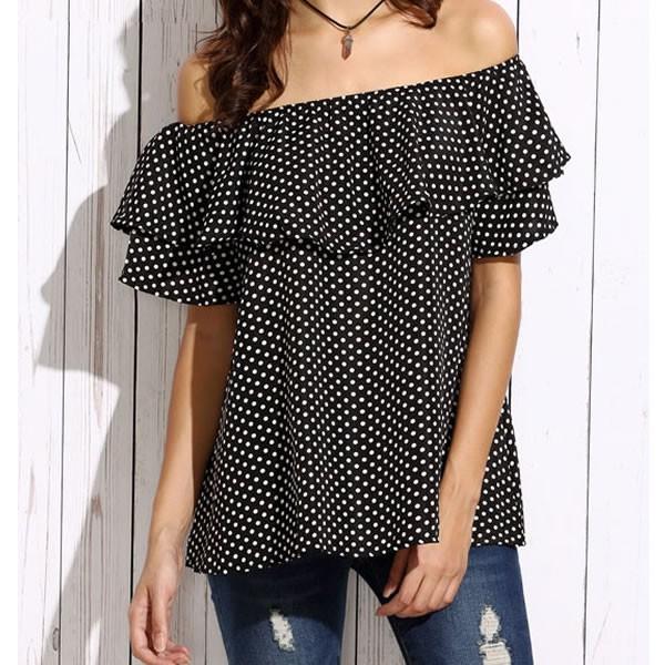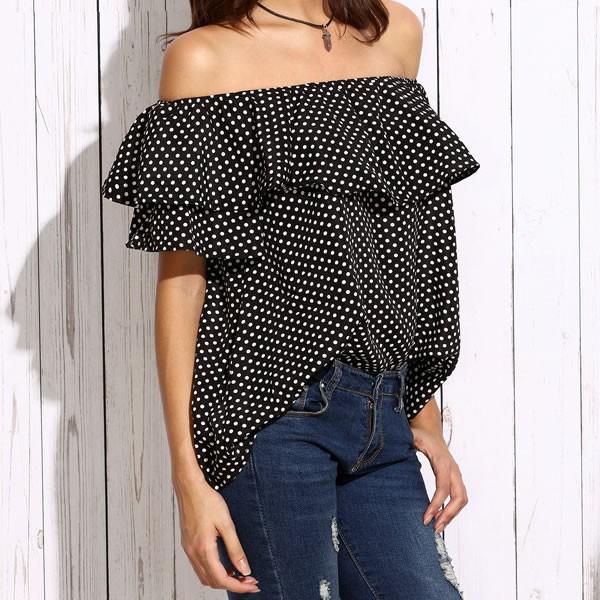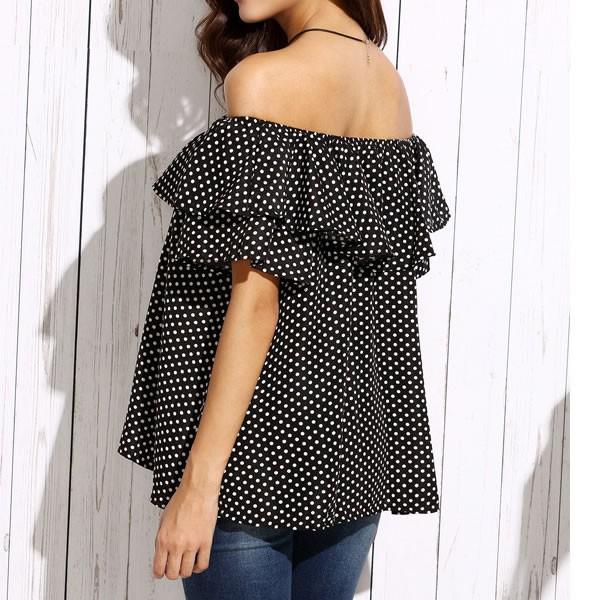 | オフショルダー ドット柄 カットソー トップス レディース 黒 ブラック 【肩だし 肌見せ トップス レディース 女性 黒 ブラック 春 夏 ロンデルブラック 水玉 総柄 オフショルダー 半袖 カットソー トップス】 | |