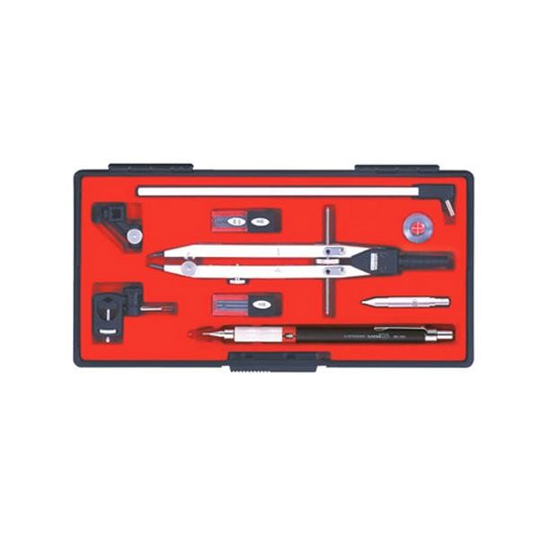 | 1本の穂替コンパスで大円から小円まで描ける製図器セット。 |