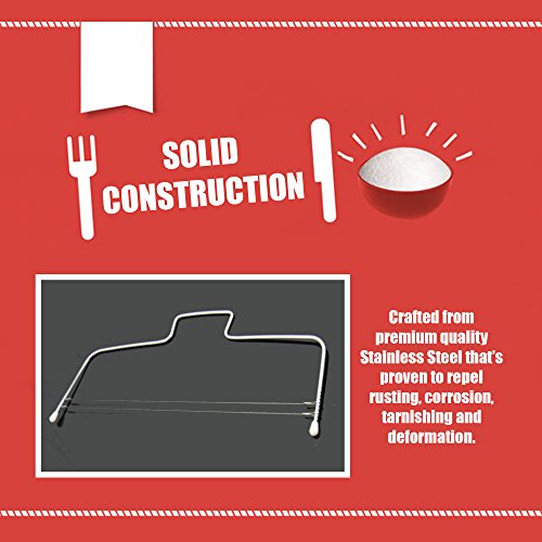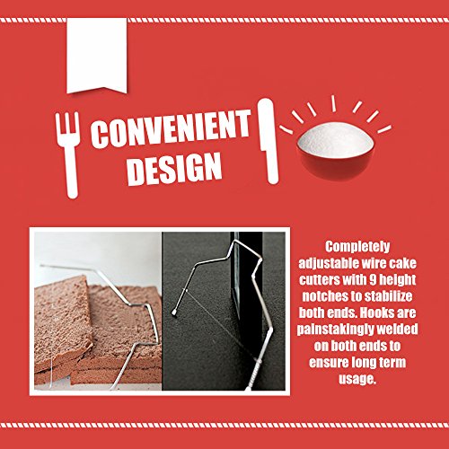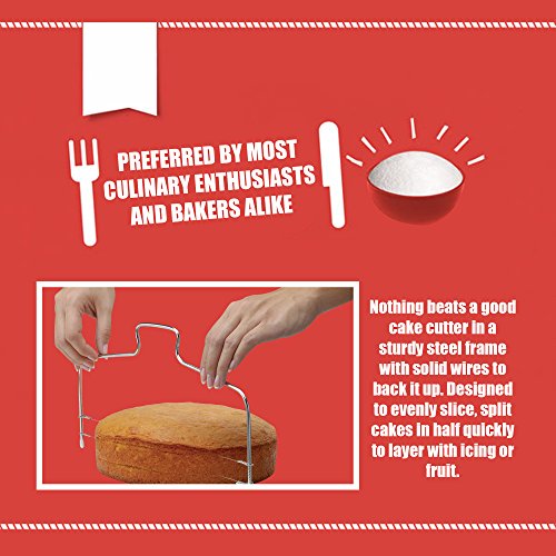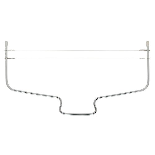 Our Premium Stainless Steel Precision Cake Leveler Metal Frame Dual Wire Bread Cutter is ideal for both professional and amateur bakers alike. The lightweight cutter is made from durable steel with carbonized polish and is used to slice a cake in to up to 3 evenly smooth sections, out of two available wires. The wire is completely adjustable so you can cut your master piece in accurate measurements. The images above will give you more details of this item. Product features: - Material: Food-grade Stainless Steel - Product dimensions: 13.5" x 6.2" - Dishwasher-safe.