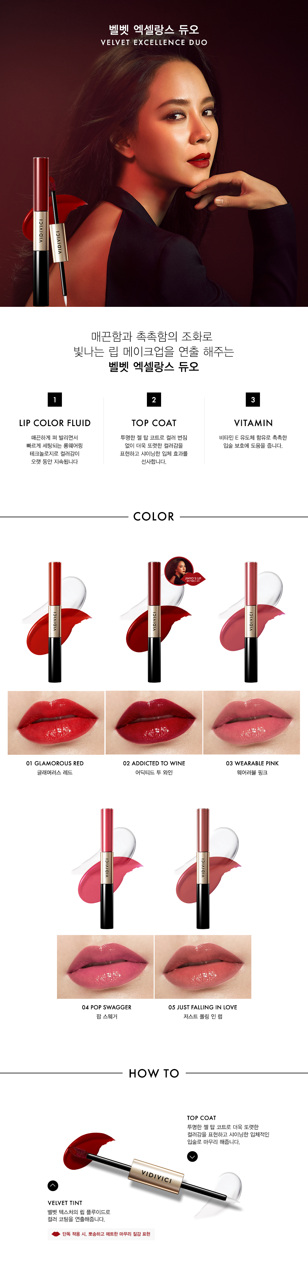 VELVET TINT_아이소도데케인, 폴리아이소프렌, 다이스테아다이모늄헥토라이트, 마이카, 티타늄디옥사이드 (CI 77891), 프로필렌카보네이트, 적색산화철(CI 77491), 실리카, 에탄올, 적색202호 (CI 15850), 실리카다이메틸실릴레이트, 탤크, 청색1호 (CI 42090), 적색201호 (CI 15850), 에칠바닐린, 황색산화철 (CI 77492), 펜타에리스리틸테트라-디-T-부틸하이드록시하이드로신나메이트, 토코페릴리놀리에이트, 비에이치티, 다이칼슘포스페이트, 황색4호 (CI 19140), 틴옥사이드