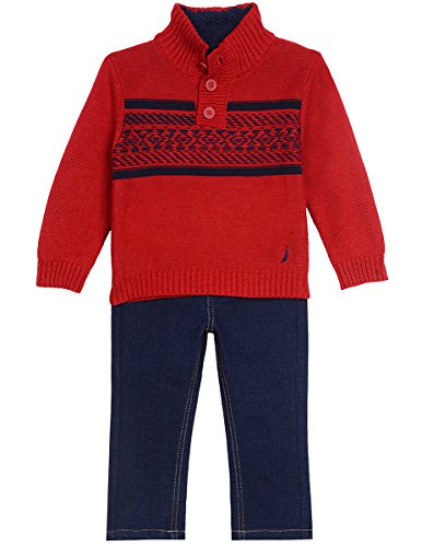 Nautica Little Boys' Sherpa Lined Fairisle Sweater, and Denim Pant Set, Red Rouge, 5/6