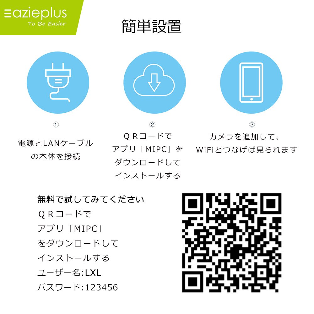 Easy network setup: If the camera has its own LAN cable and WiFi antenna, you can download free MIPC application for Android / iPhone and connect it with WiFi.