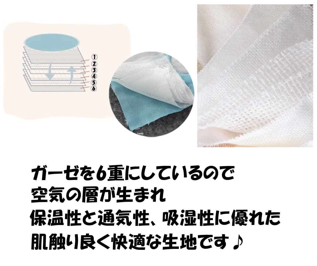 Because it is an organic cotton material, it is safe for babies sensitive to the skin ♪ Because the gauze is made six-fold, a layer of air is born, fluffy and bulging each time washing, it is a fabric excellent in heat retention and breathability.