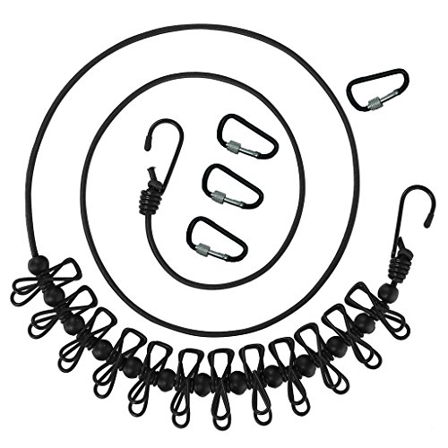 Clothesline - Eroilor Outdoor Vacation Washing Line with 12 Coated Clothespins Perfect for Camping Holiday & Balcony, 6 to 11 Feet Long (Flexible), 4 Carabiners for Free - Black