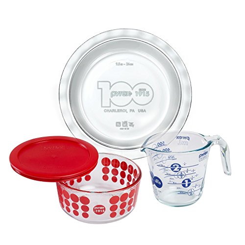 - 100 Year 4-pc Centennial Collector Set includes 1 each: 9-1/2" Pie Plate, 2-cup Blue Measuring Cup, 4-cup Simply Round Red Dots Storage Bowl with Plastic Cover