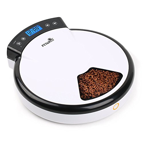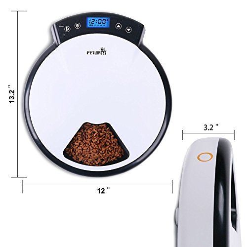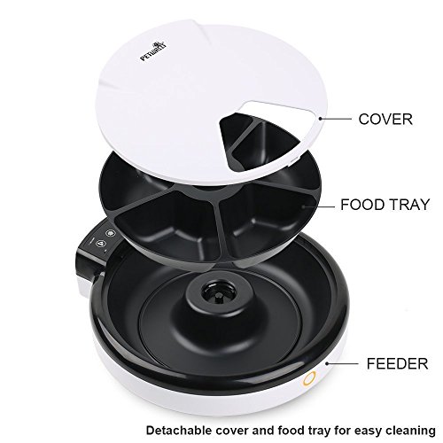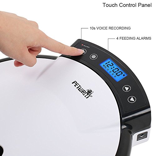 Features: -24-hour Feeding Time Setting -Five Separate Food Trays (Clockwise Rotation) -Dual Power Supply System -Touch Control Panel -Blue Backlight LCD Display (1.77" x 0.78") -Low Battery Indicator -10s Voice Recording -Built-in Distribution Alarm -Locking Mechanism -Memory Function -Dishwasher Proof (Cover and Food Tray)