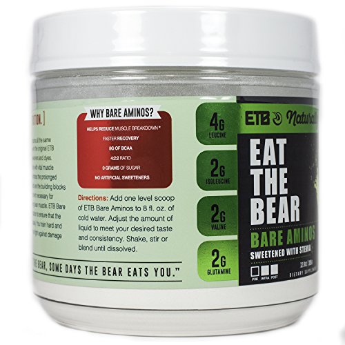 ETB Bare Aminos is a concentrated blend of amino acids to promote protein synthesis and provide one of the highest sustained peak performances available today. ETB Bare Aminos uniquely provides your body with vital muscle building elements while giving athletes the prolonged endurance they need. Amino acids are the building blocks for protein, which is the macronutrient necessary for growing, repairing and maintaining lean muscle. ETB Bare Aminos delivers the perfect formulation to ensure that the building and repair start immediately. You train hard and ETB Bare Aminos helps you win the fight against damage done by intense training. Try the new Naturally Bare Aminos which is the same great formula, now sweetened naturally with Stevia!Feature