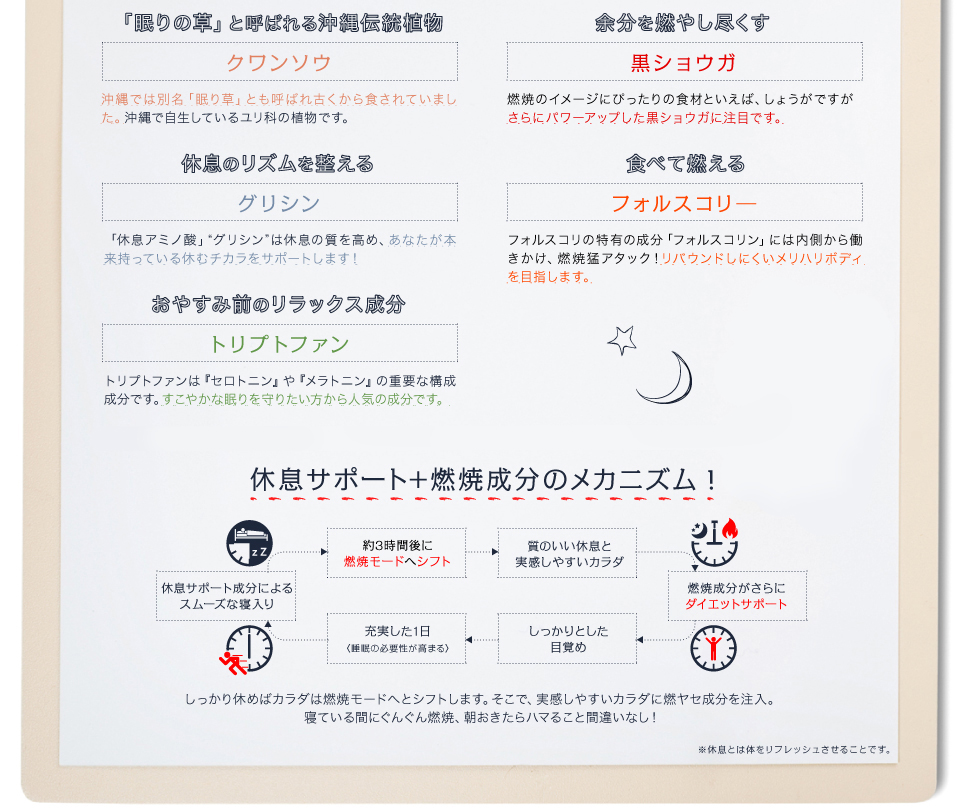 | 原材料名 | オリーブ油、デキストリン、クワン ソウエキス粉末、ブラックジンジャー抽出物、金時ショウガ末、L-カルニチン酒石酸塩、ギャバ含有米胚芽抽出物、大豆胚芽抽出物、(イソフラボン含有)コ レウスフォルスコリ抽出物、ゼラチン、グリシン、グリセリン、ミツロウ、グリセリン、脂肪酸エステル、植物レシチン(大豆由来)、L-トリプトファン |