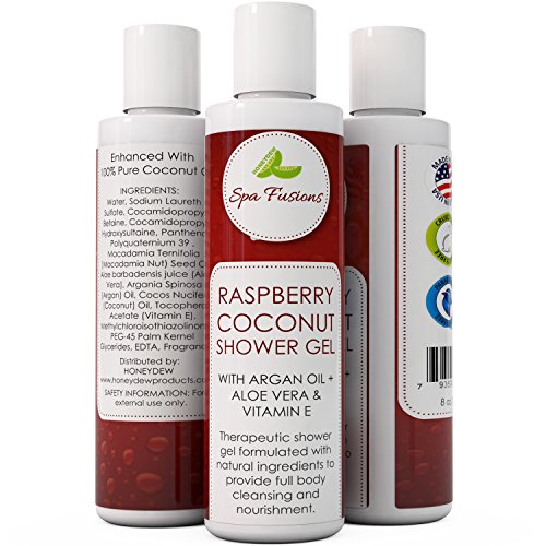 -. Binding : Misc. -. Brand : Spa Fusions -. EAN : 0793574744868 -. Feature : Raspberry Coconut Shower Gel is a natural body soap created from natural plant based ingredients. It was designed to utilize nature to its full potential and to unleash all the possible benefits to create a nourishing cleansing shower gel. / Our Moisturizing formula is specially designed to be soothing for your skin and senses. Created from ingredients that have special calming effects on the epidermis to leave you feeling soft smooth and glowing. / Our Coconut Shower Gel has a plethora of benefits. This moisturizing nourishing shower gel is also a great shaving cream which will get you a close shave without nicks, cuts, or razor burn! / SAFE AND EFFECTIVE- Raspberry Coconut Shower Gel Spa Fusions by HoneyDew is extremely gentle and effective. It is a deeply nourishing natural body wash for men and women, better than other options on the market. / 100% CUSTOMER SATISFACTION GUARENTEED - Manufactured in a state-of-the-art facility in the USA which exceeds all GMP standards. This is the Best Natural Coconut Raspberry Body Wash solution available. 100% money-back guaranteed! -. IsAdultProduct : 0 -. Label : Honeydew -. Manufacturer : Honeydew -. MPN : Coconut Shower Gel -. PartNumber : Coconut Shower Gel -. ProductGroup : Beauty -. ProductTypeName : BEAUTY -. Publisher : Honeydew -. Size : 8 OZ -. Studio : Honeydew -. Title : Coconut Oil Body Wash for Men & Women - Moisturizing Body Wash with Therapeutic Grade Essential Oil Argan Raspberry & Vitamin E - Natural Shower Gel - 8oz - Paraben & Cruelty Free - By Spa Fusions -. UPC : 793574744868