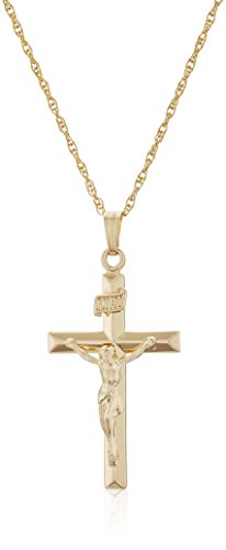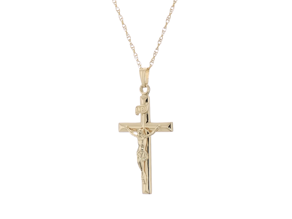 Men's 14k Gold Filled Solid Beveled Edge Embossed Crucifix Cross with Gold Plated Stainless Steel Chain Pendant Necklace, 18"