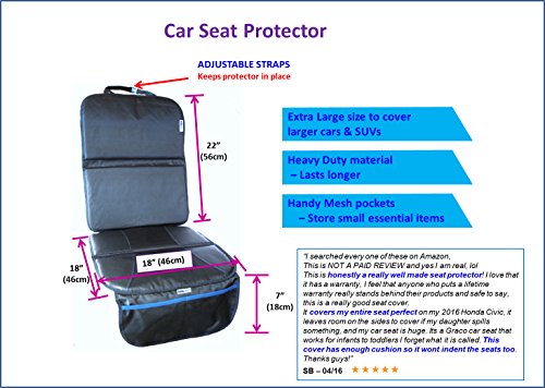 COMPLETE PROTECTION FOR YOUR LEATHER & FABRIC CAR SEATS – The KoolAcc deluxe child car seat protectors are designed to protect your back seats from dents scratches and scuff marks caused by toddler car seat or booster. The baby car seat cover mat can be easily cleaned of any stains and spills. The carseat protectors storage pockets protect the front of the car seat from dirty shoes and are a handy storage for toys diapers wet wipes etc.