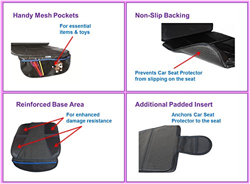 DESIGNED TO HOLD YOUR BABY SEAT FIRMLY IN PLACE - the auto seat cover has 3 features that are designed to keep your baby seat securely in place – 1) an adjustable strap that clips around the back of the headrest to keep the car seat guard from sliding down. 2) a padded flap to insert between the seat and the seat back that further anchors the car seat pads to the seat and 3) special non-slip backing that prevents the seat back protector from slipping on the car seat.