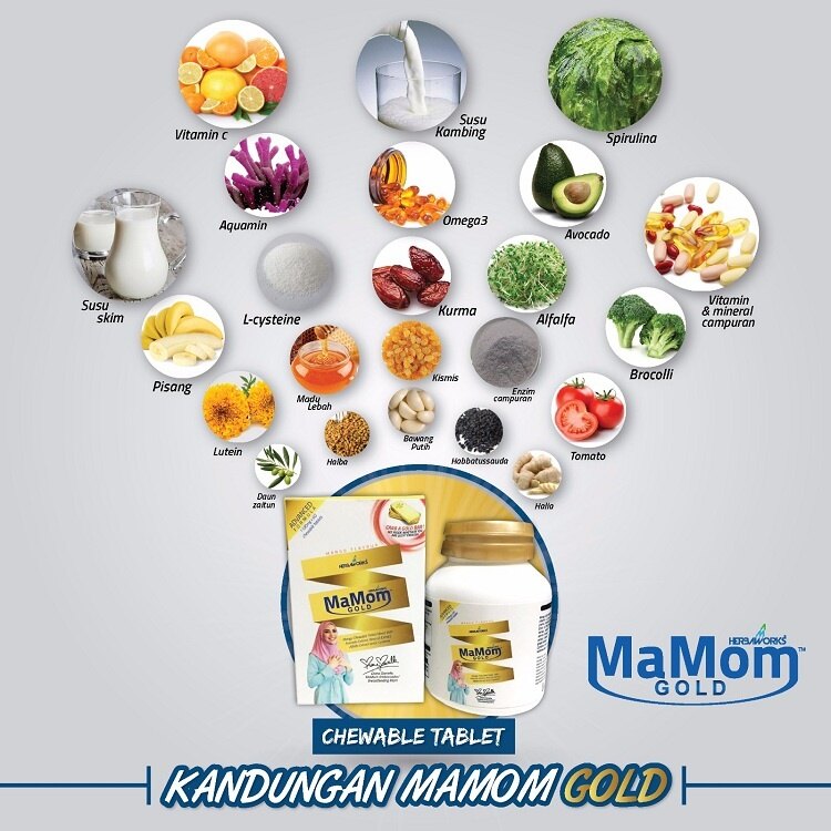 Chewable tablet diperbuat daripada avocado extract (flawless), L-cysteine & olive leaves (memutihkan) dan tomato (melembutkan).Selain itu, MaMom Gold berfungsi untuk..