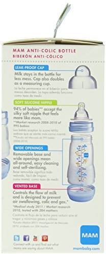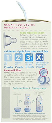 -. Binding : Baby Product -. Brand : MAM -. Color : Pink -. Department : baby-boys -. EAN : 0845296050311 -. Feature : BPA- free, Can be sterilized in the microwave in just 3 minutes! / Wide openings and 5 parts make for easy cleaning / The MAM Ultra Soft Silicone Nipple makes for an easy switch between breastfeeding and bottle-feeding / Base ventilation systems provides a smooth milk flow which reduces air swallowed by baby, gas and burps / Comes with a slow flow nipple -. Label : MAM -. Manufacturer : MAM -. Model : 5031-006-3-1 -. MPN : 593_5031-006-0-0 -. PackageQuantity : 1 -. PartNumber : 593_5031-006-0-0 -. ProductGroup : Baby Product -. ProductTypeName : BABY_PRODUCT -. Publisher : MAM -. ReleaseDate : 2011-01-21 -. SKU : 593_5031-006-0-0 -. Studio : MAM -. Title : MAM Anti-Colic Bottle Girl, 5 Ounce, Single Pack -. UPC : 845296050311