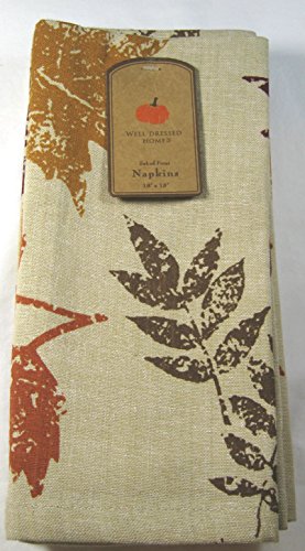 -. Binding : Kitchen -. Brand : Well Dressed Home -. Color : Shades of Rust, Brown and Tan on Beige -. EAN : 0644042528285 -. Feature : Machine Wash-Tumble Dry / 100% Cotton / Crafted from the finest materials available / Measurements 18" x 18" / Autumn Leaves -. IsAutographed : 0 -. Label : Well Dressed Home -. Manufacturer : Well Dressed Home -. PackageQuantity : 4 -. ProductGroup : Home -. ProductTypeName : HOME -. Publisher : Well Dressed Home -. Size : 18" x 18" -. Studio : Well Dressed Home -. Title : Set of 4 Well Dressed Home Napkins Autumn Leaves100% Cotton - 18" X 18" -. UPC : 644042528285