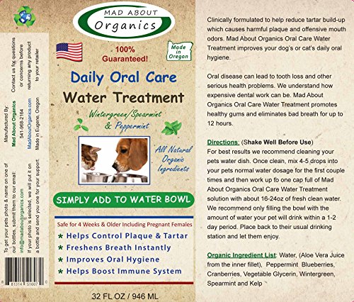 Maintaining healthy teeth and gums is very important for your pet's overall health. Plaque and tartar buildup on the teeth causes inflammation of the gums, allowing harmful bacteria to damage your pet's teeth and also travel in the bloodstream to infect the heart, kidneys and liver. We know that veterinary dental cleanings are not only very expensive, but they put your pet at risk from the anesthesia. That's why we developed our easy-to-use Daily Oral Care Water Treatment. Simply add to your pet's water dish. The product works to soften existing plaque and tartar, help heal the gums, and freshen your pet's breath. With regular use after a few weeks, existing plaque and tartar build-up will either naturally fall off or you can use a toothbrush to help brush it off. Once removed, continued use of the water treatment will prevent future plaque and tartar build-up, thus blocking harmful bacteria from causing inflammation of the gums and accessing the bloodstream.Organic Ingredient List:Water, Aloe Vera Juice (from the inner fillet), Peppermint, Blueberries, Cranberries, Vegetable Glycerin, Wintergreen, Spearmint, KelpNestled in the Pacific Northwest in Eugene Oregon, Mad About Organics started in 2007. Our mission is to take a different approach to protect animals from insects organically, eliminating the traditional toxic chemical treatments that can cause major issues in pets.Like you, we only want the best for our animals and have now developed a complete product line consisting of: Flea and Tick, Advanced Dental Care, Healing Skin/Itch Relief, Soothing Shampoos, Healing Ear Cleaner, Healing Salve and our amazing Healing Liniment.Our goal at Mad About Organics is to continue to provide the safest, most natural and effective animal care products for you and the ones you love.Feature