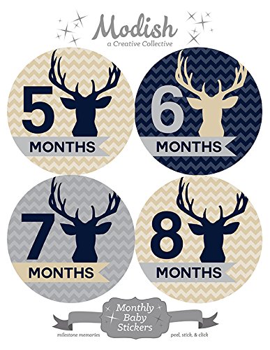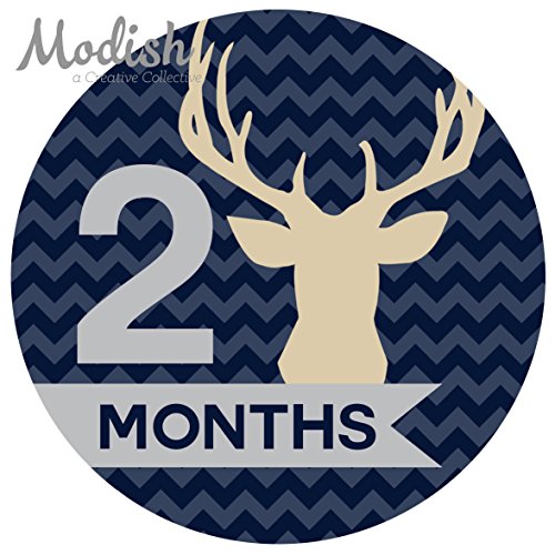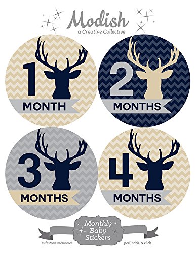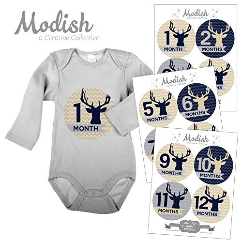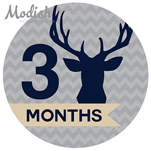 12 Monthly Baby Stickers, Boy, Deer, Antlers, Baby Belly Stickers, Baby Month Stickers, First Year Stickers Months 1-12, Chevron, Tan, Beige, Taupe, Blue, Navy,...