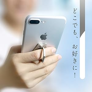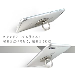 リング部を立てる事で、縦置き・横置き自在のスマホスタンドになる。