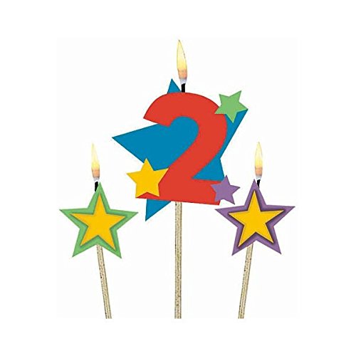 Party Time Stars and Number 2 Celebration Candle on a Stick, Pack of 3, Multi , 7" Wax